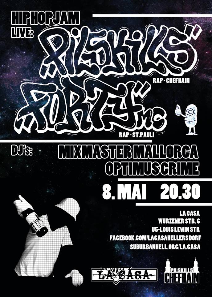 Wir freuen uns am Tag der Befreiung Pilskills in unserem Hause ankündigen zu dürfen. Dazu haben wir uns Forty MC eingeladen, welcher schon beim Rand.Gestalten Festival letztes Jahr bei uns zu Gast war.Optimus Crime und Mixmaster Mallorca runden den ganzen Abend ab.Es wird uns ein Fest!!