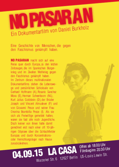 Auf einer Reise quer durch Europa, zu den letzten ZeitzeugInnen, die im Spanischen Bürgerkrieg und im 2. Weltkrieg gegen den Faschismus gekämpft haben, macht sich „NO PASARAN“ auf die Suche nach Antworten.Im Zentrum dieses multinationalen Dokumentarfilms stehen die Lebenswege und persönlichen Schicksale von Gerhard Hoffmann (Österreich), Rosario Sanchez Mora (Spanien), Herman Scheerboom (Niederlande), Kurt Julius Goldstein1 (Deutschland), der Brüder Joseph und Vincent Almudever (Frankreich) und von Giovanni Pesce und seiner Frau Onorina Brambilla Pesce (Italien). Als sie sich als Freiwillige gemeldet haben, waren sie in der Mehrzahl noch Jugendliche. Doch keiner von ihnen hatte damit gerechnet, erst nach einer oft 10-jährigen Odyssee über die Schlachtfelder Europas und durch Konzentrations- oder Vernichtungslager nach Hause zurückzukehren.
