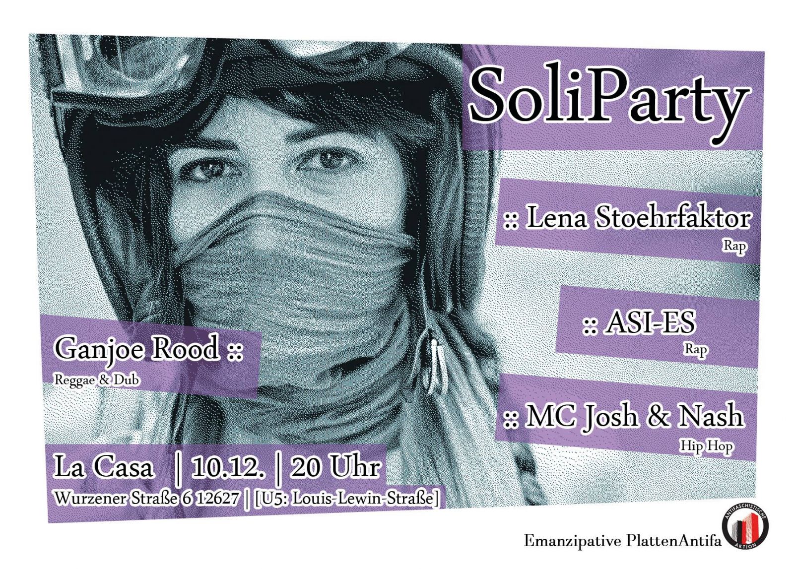 Das Jahr geht dem Ende zu und in Hellersdorf ist die politische Situation nur bedingt besser geworden. Die rassistischen Massenaufmärsche und Mobilisierungen der Jahre 2013 und 2014 sind am Ende. Dafür konnte sich eine aktive Naziszene bilden, die in letzter Zeit vermehrt versucht, mit ihrer Propaganda den öffentlichen Raum einzunehmen. Mit dem Wahlerfolg der AfD hat sich die Hetze der Nazis gegen Geflüchtete nun auch in der Bezirksverordneten Versammlung niedergeschlagen. Aus diesem Grund veranstaltet die Hellersdorfer Jugendantifa EPA (Emanzipative Plattenantifa) eine Soliparty, denn unser Engagement braucht Geld. Unsere Feunde vom LaCasa haben uns hierfür ihre Räumlichkeiten zur Verfügung gestellt. Wir wollen diesen kulturellen Rahmen nutzen, um mal wieder fette Beats mit kreativen und vor allem linken Musikern zu verbinden und unsere Message in den ganzen Bezirk zu tragen.