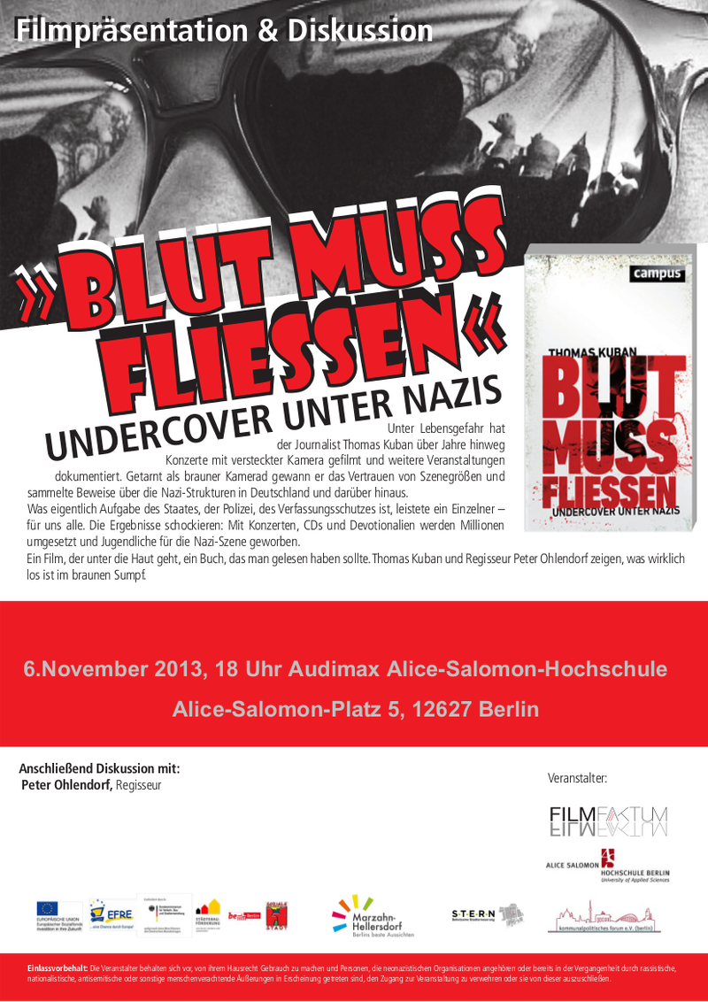 Am 6. November gibt es im Audimax der Alice-Salomon-Hochschule ab 18 Uhr den "Film Blut Muss Fliessen" - Undercover unter Nazis über die deutsche Rechtsrock-Szene zu sehen.